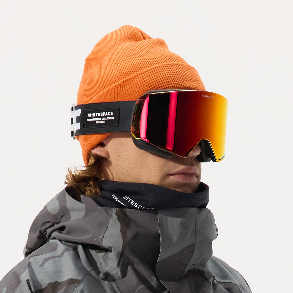 Ski goggles with orange lens and black strap showing brand logo on a white background.