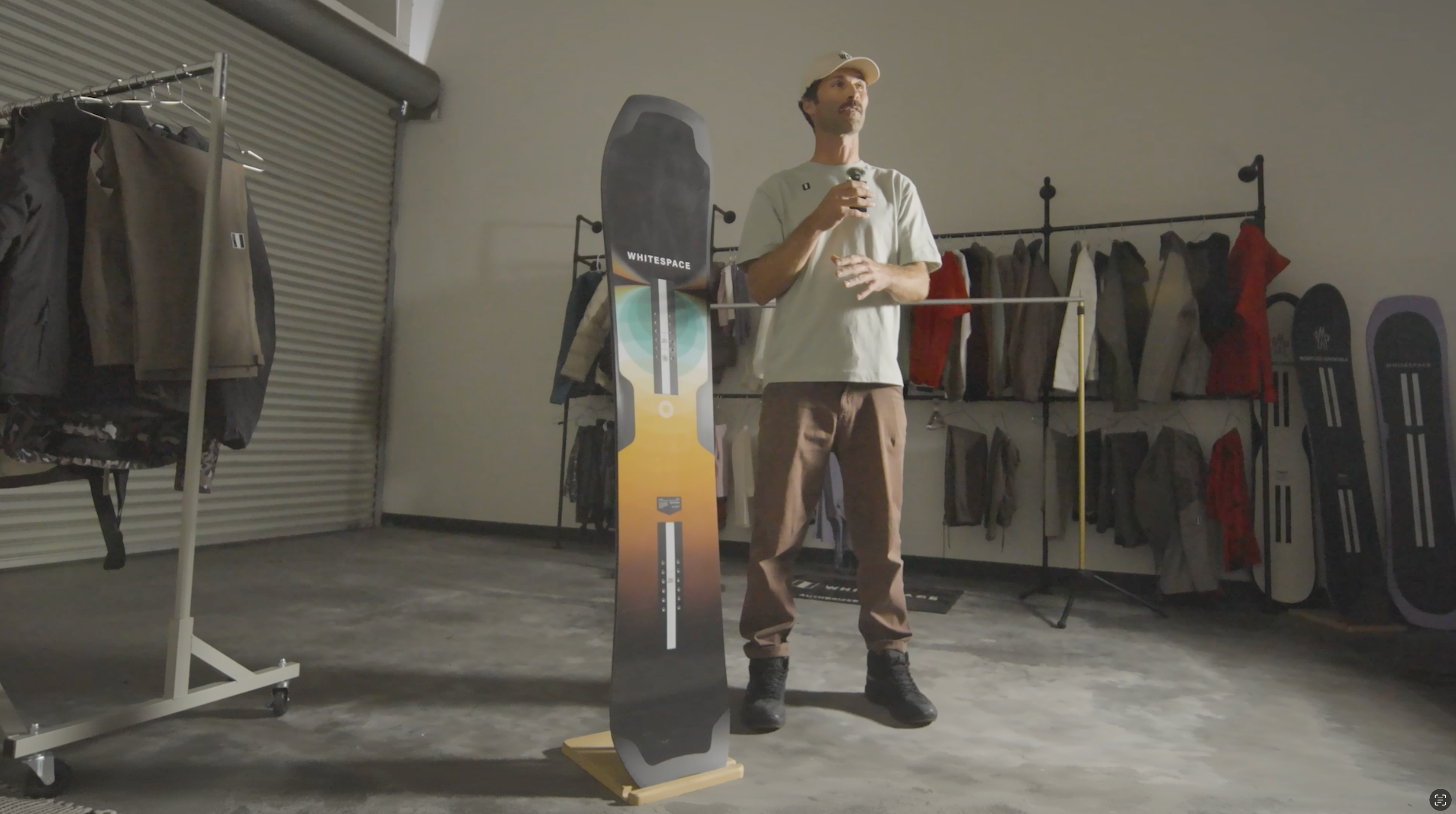 Person holding a snowboard with 'Whitespace' branding in a snowy setting