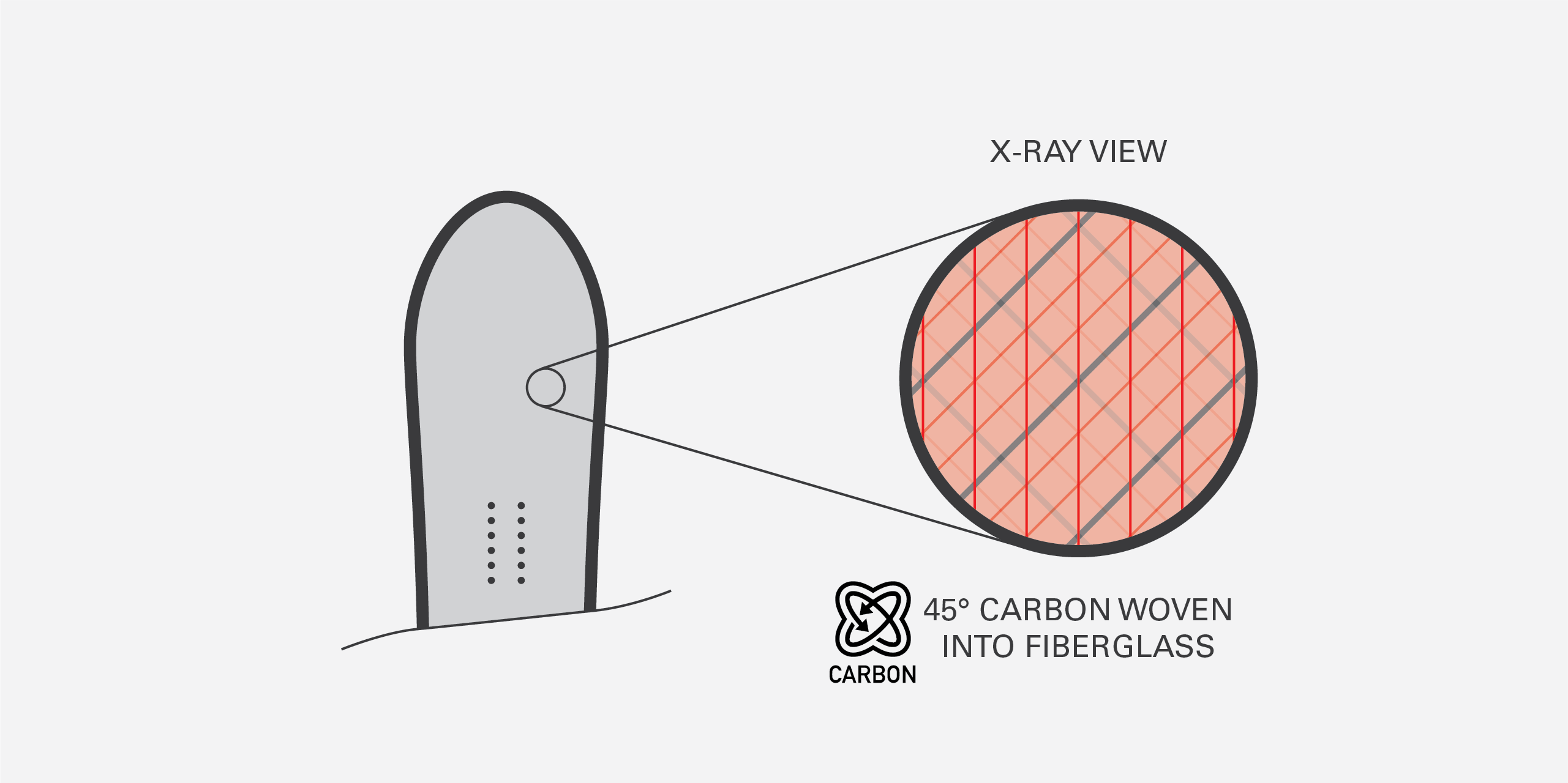 An ultra light 45° densely woven fiberglass with carbon inserts provides a smooth ride with less weight under foot.