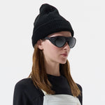 Block + wordmark embroidery centered on fold, block embroidery on back left of beanie