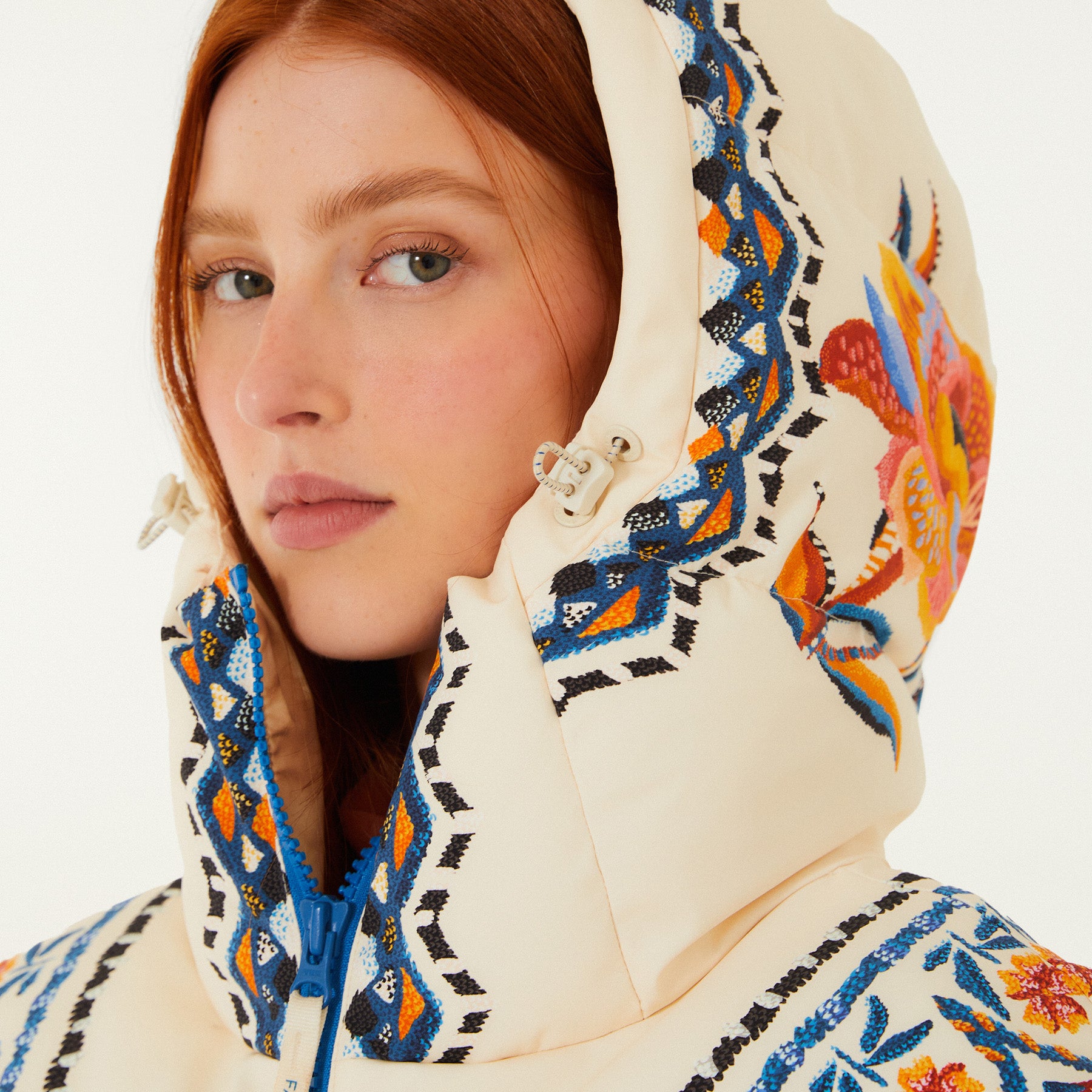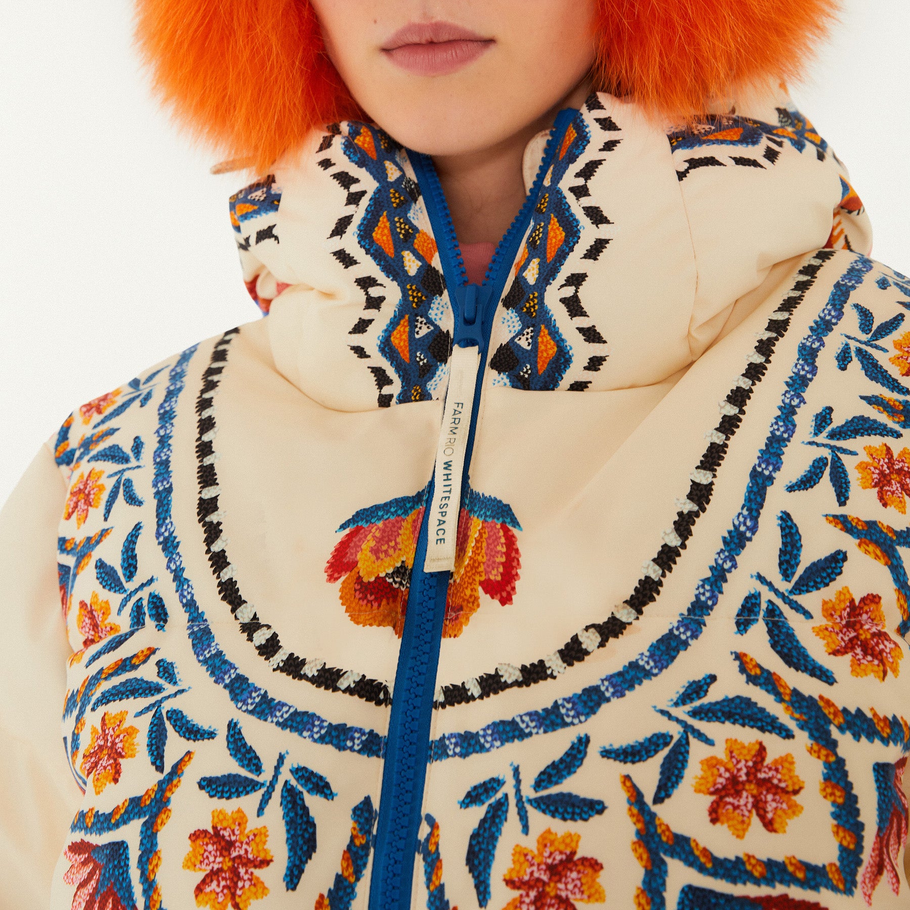 Model wearing Farm Rio Lucy Floral Puffer Jacket, a cream colored jacket with blue and yellow floral designs, coordinating pants, dark sunglasses, and fluffy orange ear muffs, on a white background.
