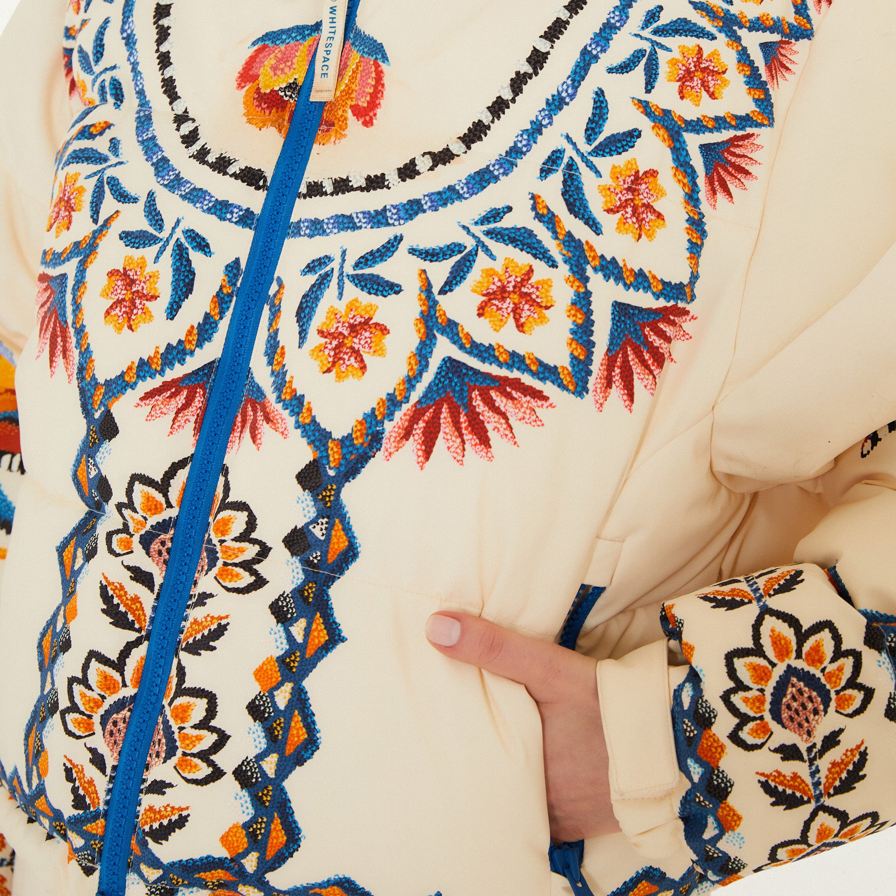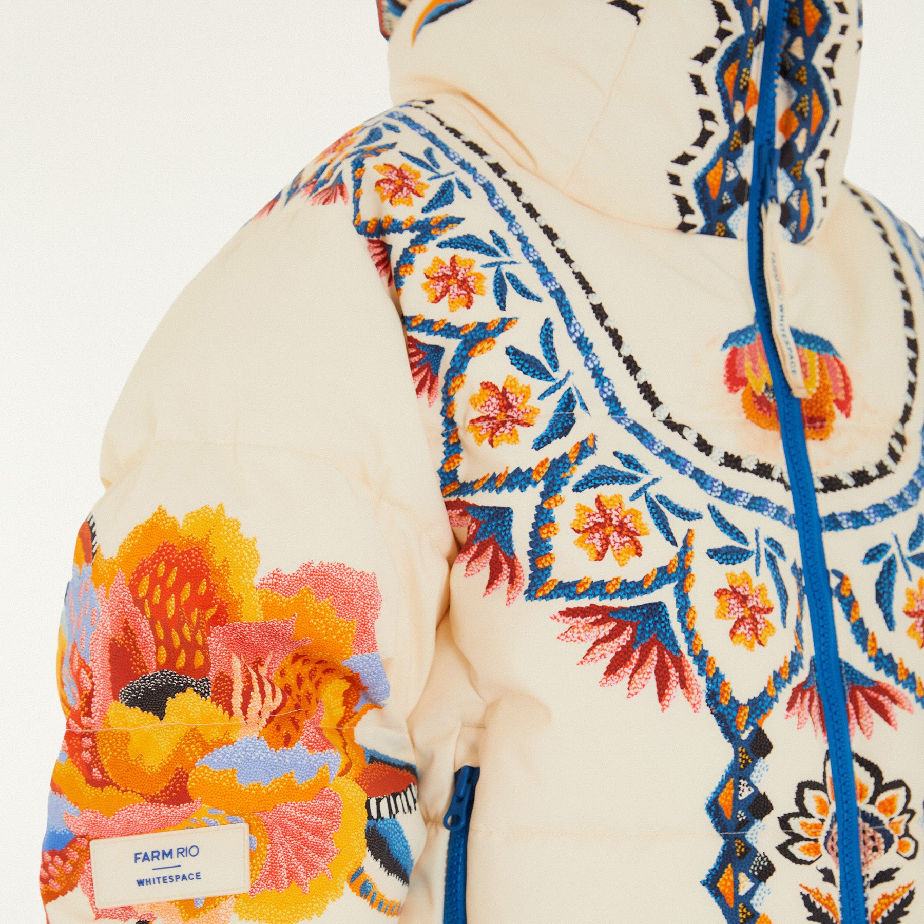 Flat lay photo of Farm Rio Lucy Floral Puffer Jacket, a cream colored jacket with blue and yellow floral designs, on a white background.