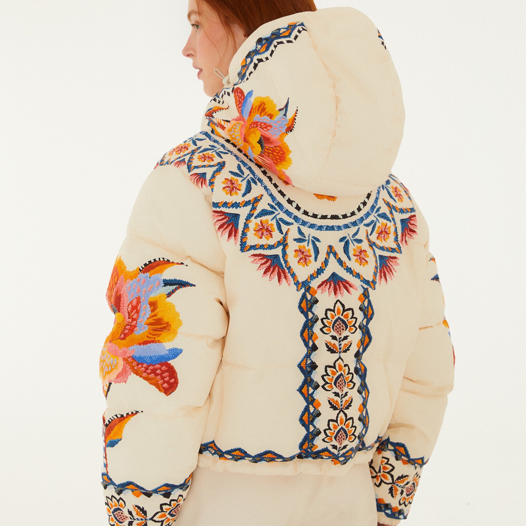Model, from the back, wearing Farm Rio Lucy Floral Puffer Jacket, a cream colored jacket with blue and yellow floral designs and coordinating pants, on a white background.
