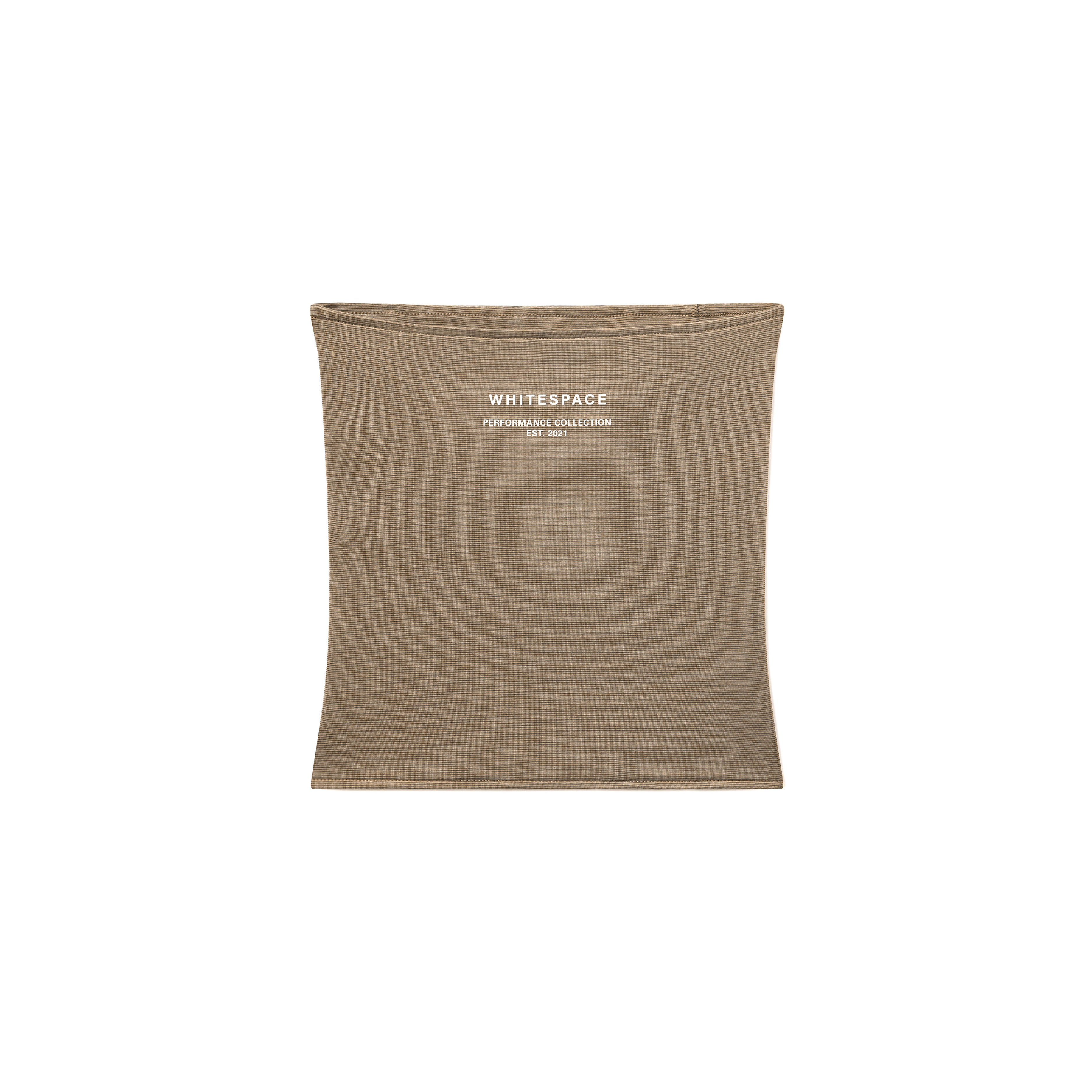 Brown neck gaiter with 'WHITESPACE' logo on a white background