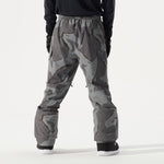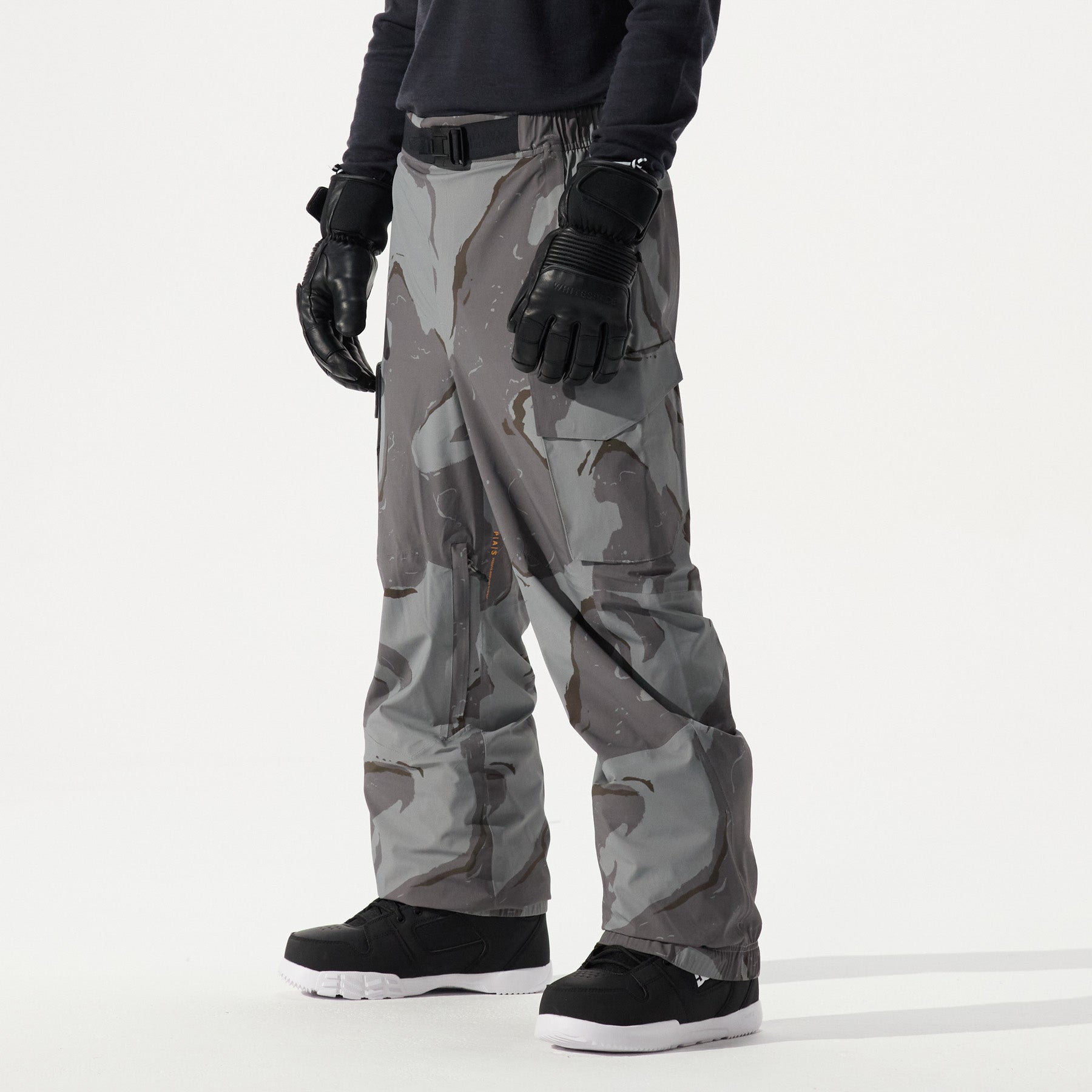 Model wearing black leather ski gloves and camouflage pants on a white background