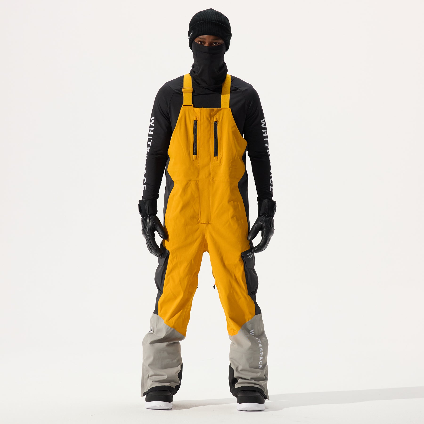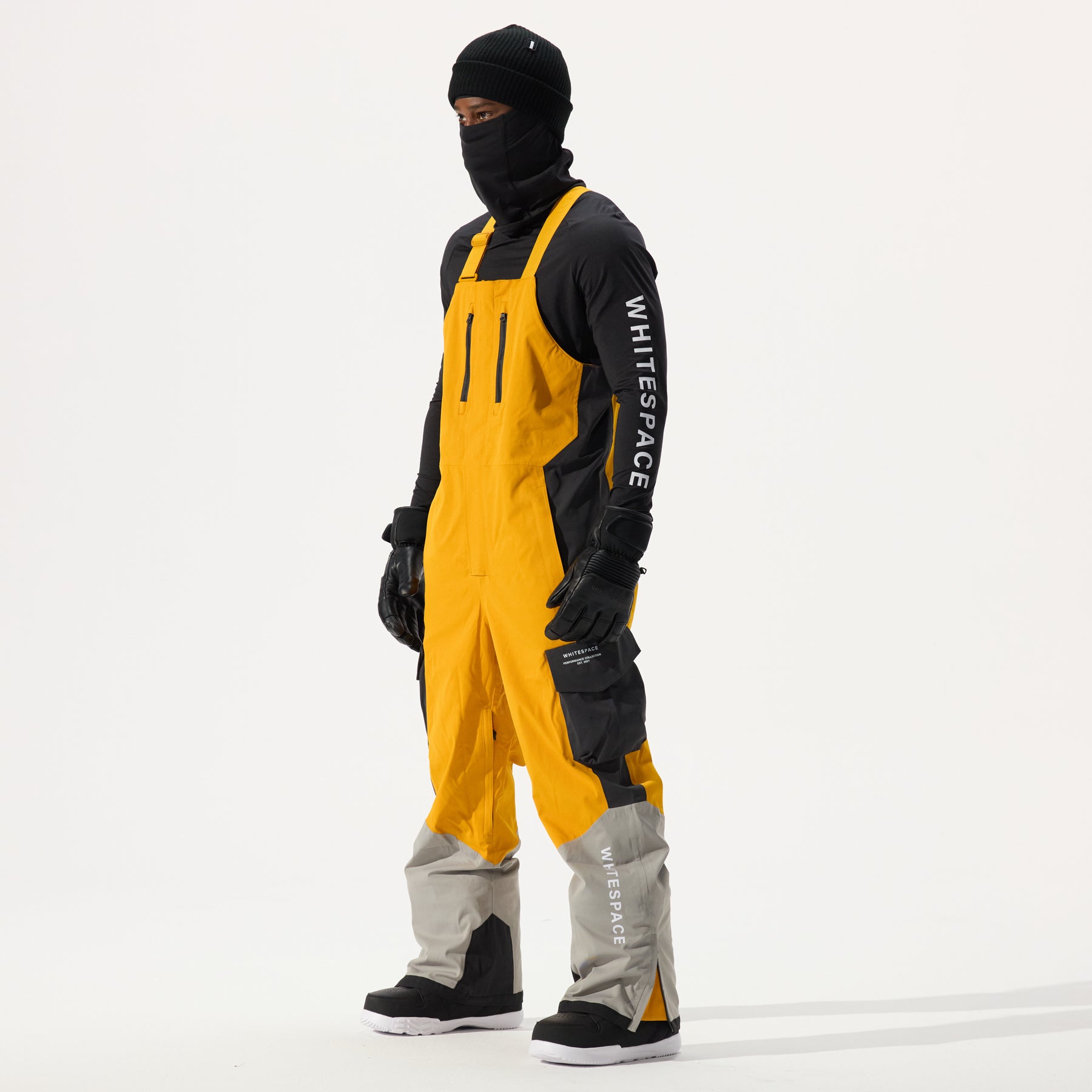 Model wearing 2L Insulated Cargo Bib Pants in Yellow over a black Whitespace long sleeved tee, a black beanie, and a black gaiter, on a white background.