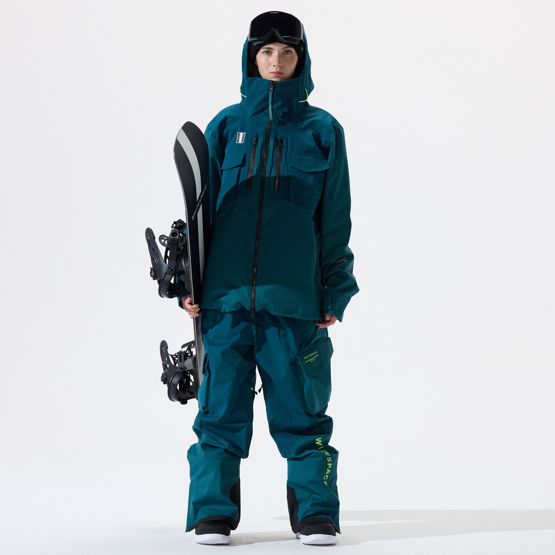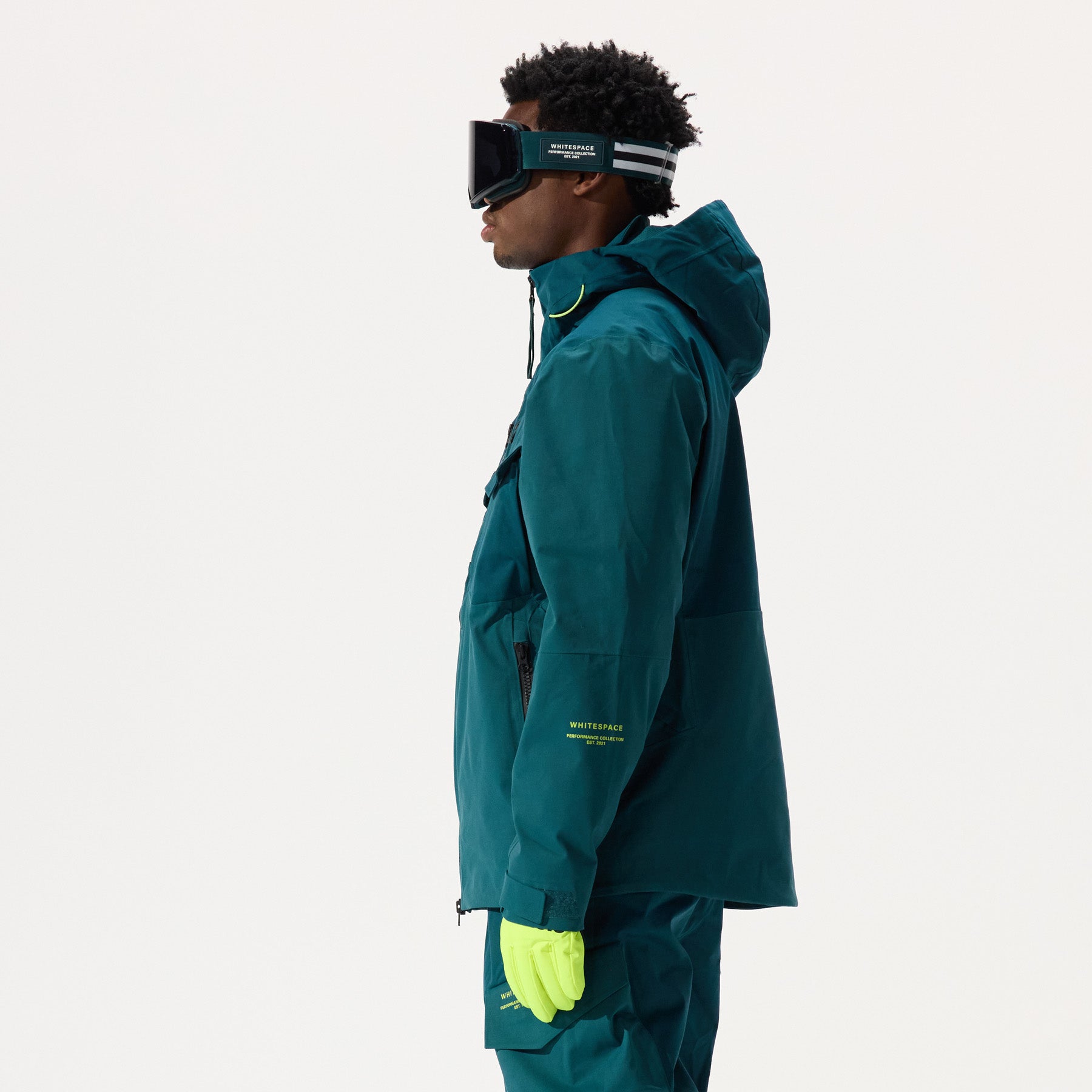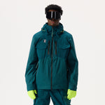 Model, from the side, wearing the 2L Insulated Cargo Jacket in Atlantic Deep colorway and ski goggles, on a white background.