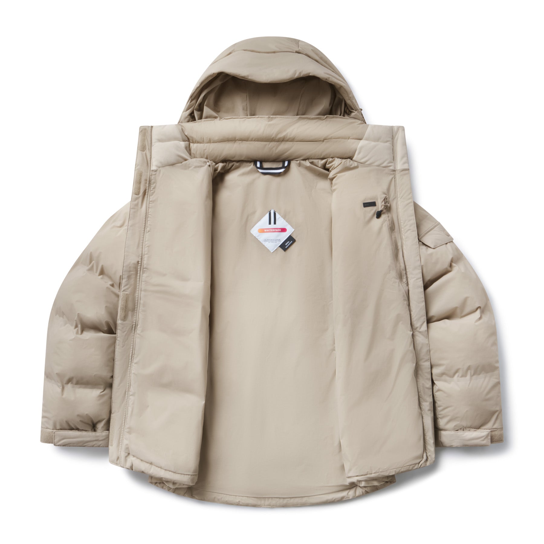 Model wearing Insulated Parka Jacket in Plaza Taupe, on a white background, demonstrating the inner zipper storage pocket