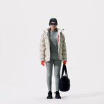 Model wearing Insulated Parka Jacket in Plaza Taupe, on a white background, demonstrating the inner zipper storage pocket