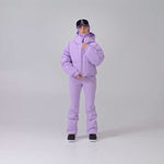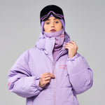 Woman standing on a snowy mountain holding a WhiteSpace snowboard and wearing Cropped Puffer Jack in Lilac Purple and pants.