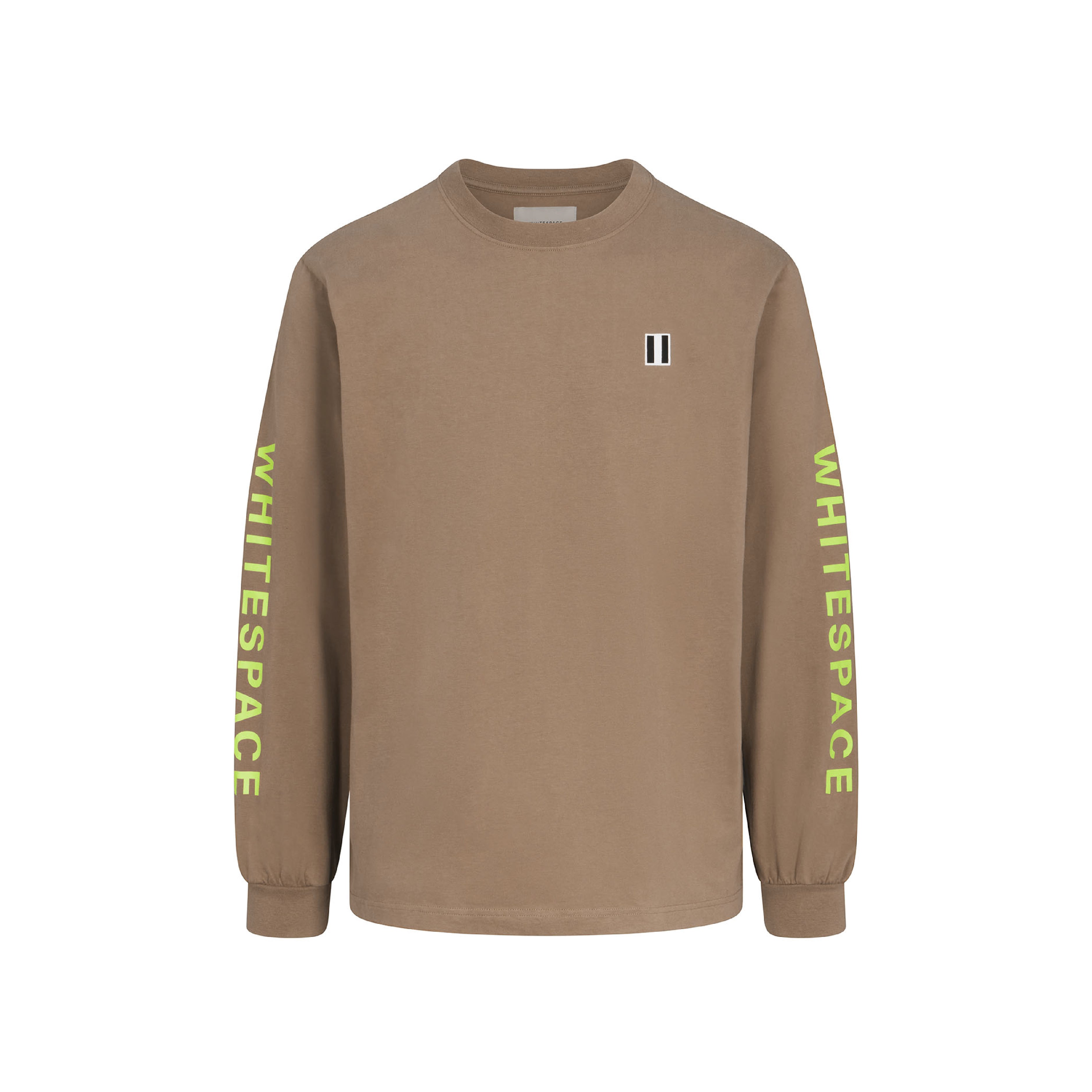 Wordmark logo screenprint on left and right sleeves, block logo screenprint on left chest