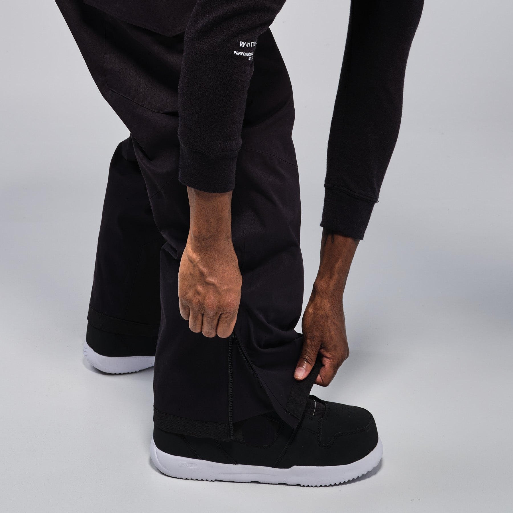 Black bib ski overalls on a white background