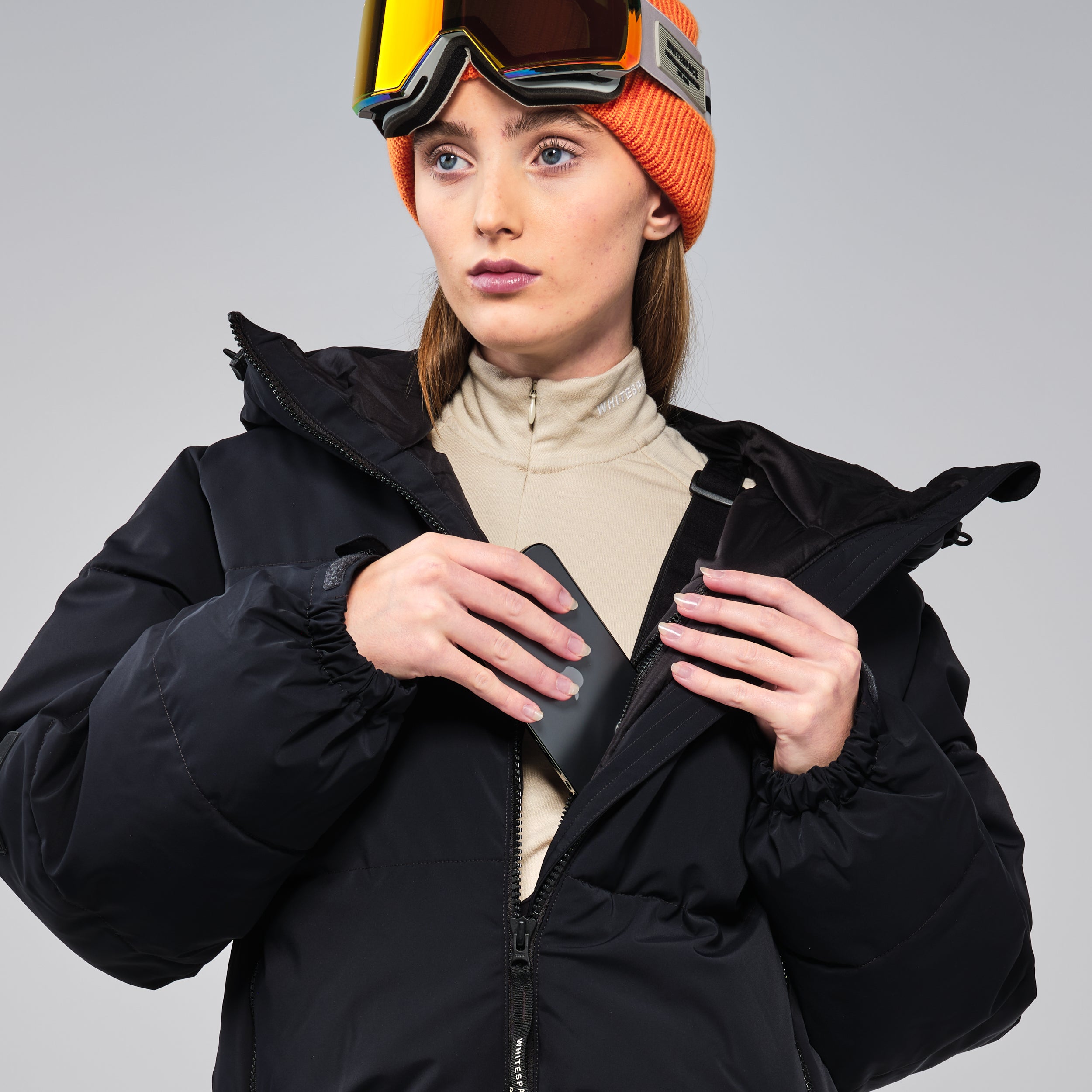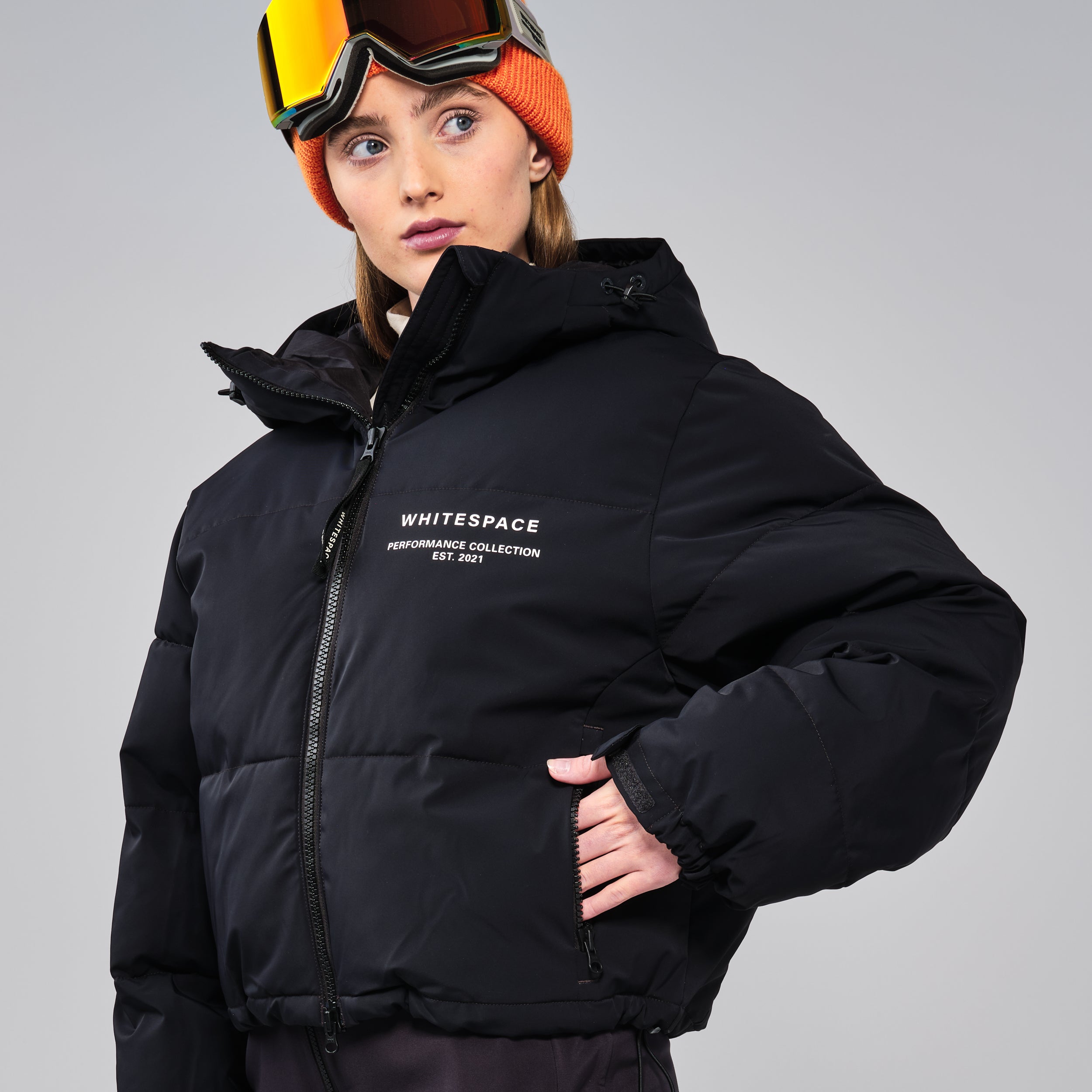 The Cropped Puffer Jacket is the ultimate blend of style and performance, featuring an oversized silhouette with a cropped fit for a sleek, modern aesthetic. Enlarged synthetic-filled baffles offer superior warmth, while the 2-layer shell and waterproof membrane provide reliable weather protection. The oversized hood with insulated baffles wraps you in warmth, making this puffer the perfect choice for cold, dry days on and off the mountain.