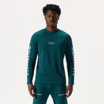Model, from the back, wearing graphine crewneck and graphine basepant in atlantic deep colorway on a white background.