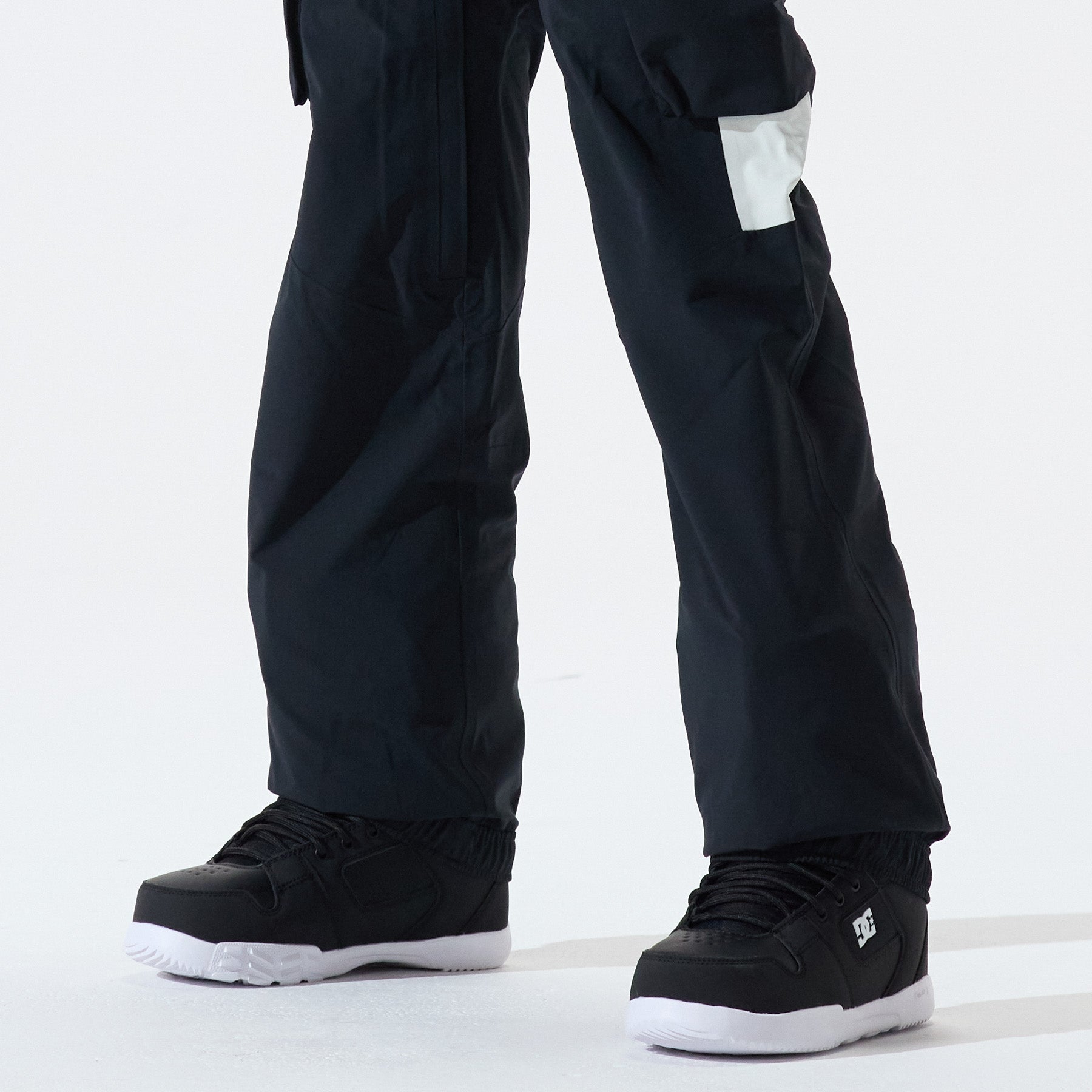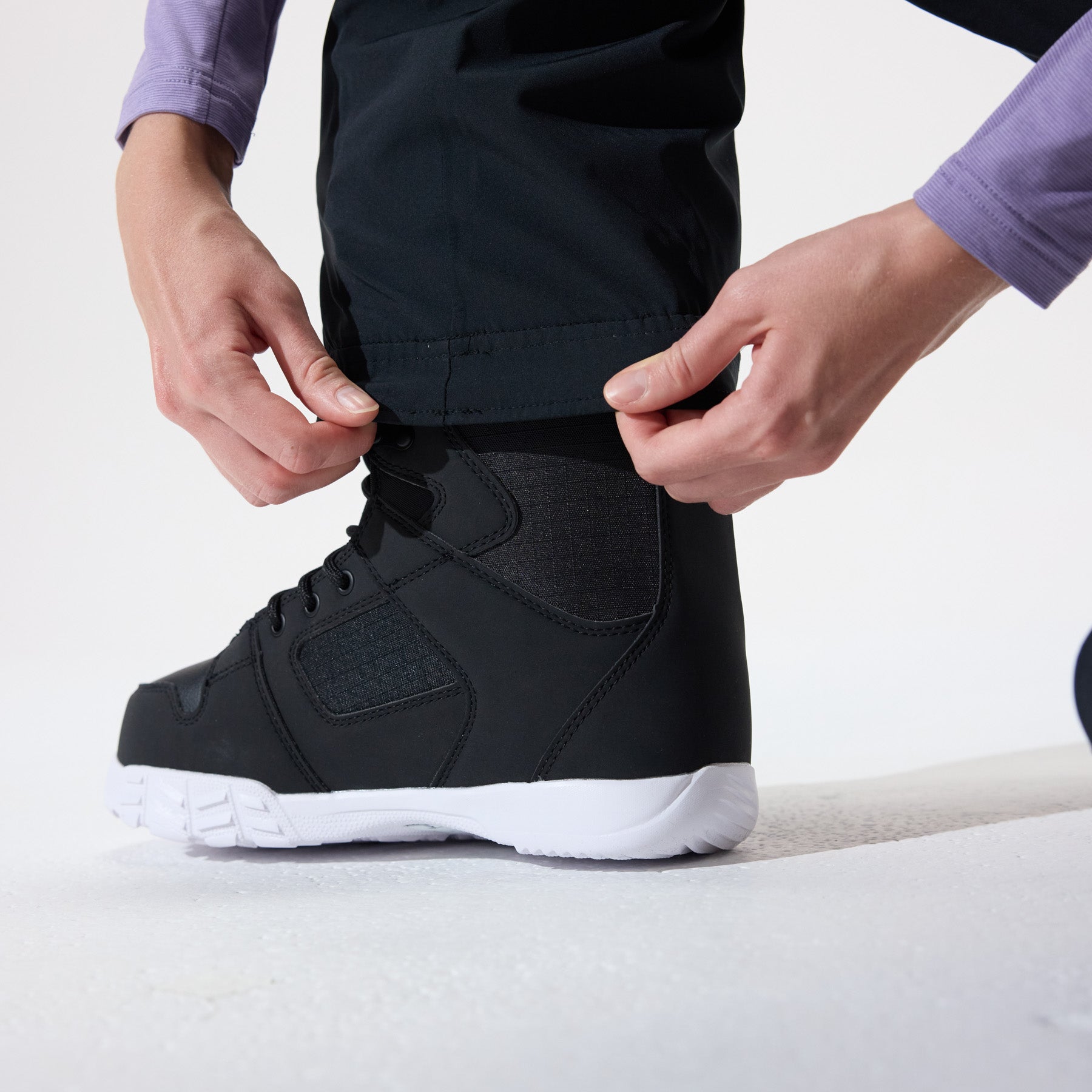 Pant fit can be a real struggle but these are really accommodating thanks to the adjustable waist belt and adjustable bib straps. I usually wear a medium but I sized up because I like a baggier fit and I was happy with my choice. The fabric is kind of the star of the show here, which I never would have known while looking on the website, but it's got a nice stretch to it and it just feels very easy to move in these. A lot of snow apparel can be weirdly crunchy or restrictive and these just felt so freeing to ride in. I love them. The pockets are well designed and I was grateful that the cinched cuffs fit perfectly over my W9 Vans boots because they can be kind of bulky, but everything fit great.